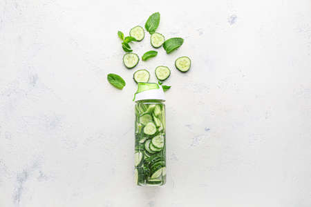 Refreshing cucumber and lime drink on white surface