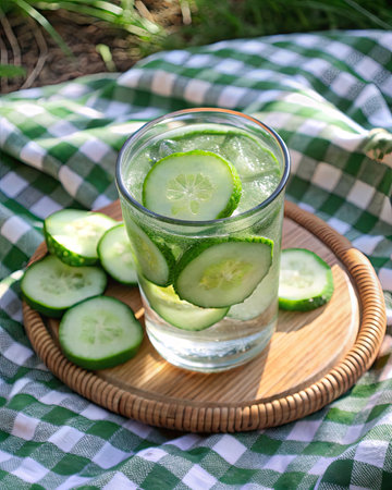 Refreshing cucumber and mint drink on a picnic table.