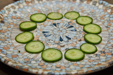 Fresh sliced cucumbers are laid out on a plate. Top view.