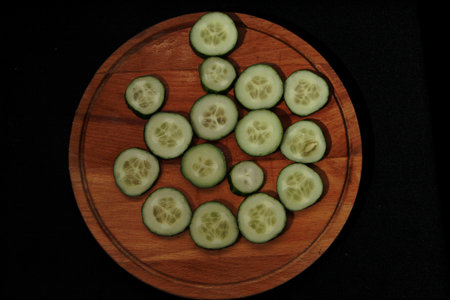 Seasonal diet and nutrition, healthy eating concept. Bunch of sliced fresh green cucumbers on the black background, top view of cucumber slices in the bowl covered with water drops.