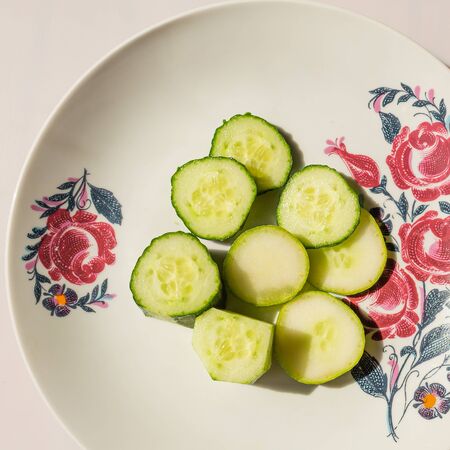 Fresh cucumber salad on white plate. Sliced fresh cucumbers.