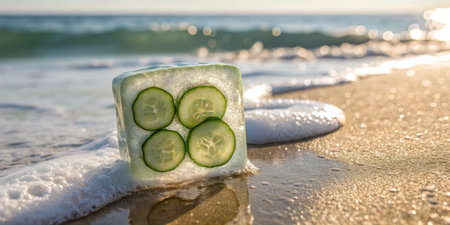 A frosty block of ice with cucumber slices rests on sandy shore while gentle waves lap nearby.