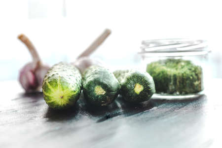 Cucumbers, garlic and dill. Polish salad with cucumbers. Black background. Delicious additions to dinner. Summer cuisine.