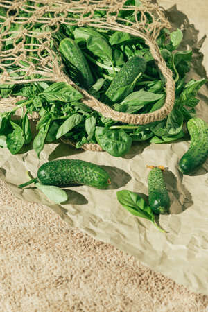Creative layout made of fresh basil and cucumbers in mesh bag on craft papar background. Healthy food ingredient concept. selective focus