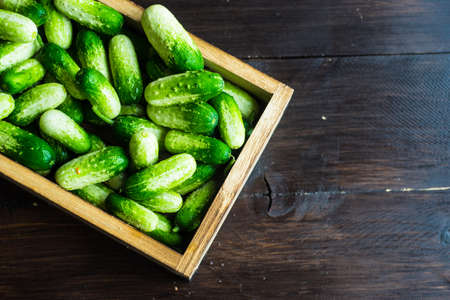 Organic cucumbers on rustic wooden background with copy space as a healthy food concept