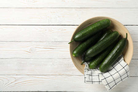 cucumbers. Fresh green organic cucumbers in bowl, top view.
