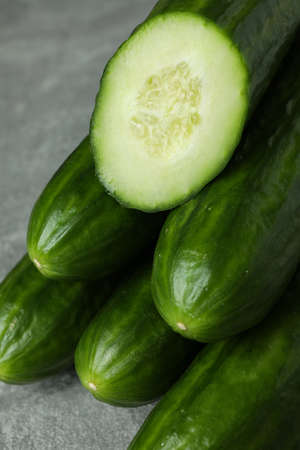 Cucumber on green texture background. Cucumbers harvest in summer. Cucumbers for salads or canning. Summer vegetables.