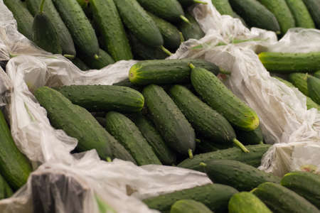 Fresh young green cucumbers. cucumbers on the shelf of the supermarket, food background.
