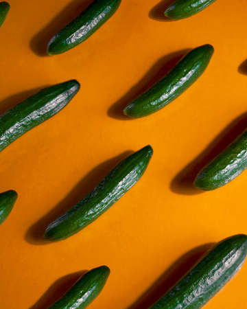 Pattern of fresh cucumbers on orange surface. Top view of green cucumbers arranged on orange background.