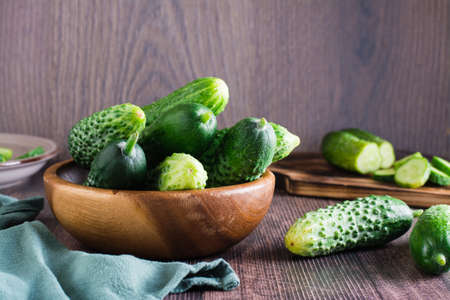 Fresh whole cucumbers in a bowl and on a wooden table. diet organic food.