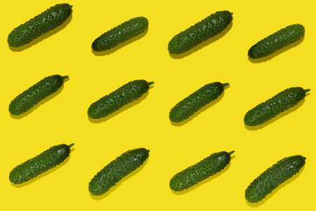 Summer color food seamless pattern - fresh green young cucumber in sunlight with shadows on yellow background.