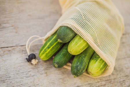 Cucumbers in a reusable bag on a stylish wooden kitchen surface. Zero waste concept.