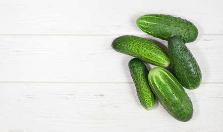 A few fresh green cucumbers on a light background. The concept of natural food. Selective focus