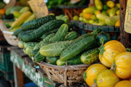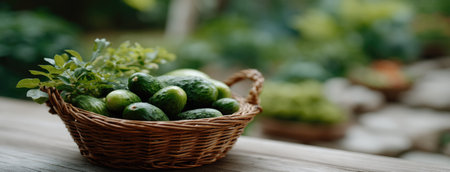 A woven basket brimming with vibrant green cucumbers sits amidst the garden foliage, showcasing a scene of abundance and freshness. Ideal for healthy meals.