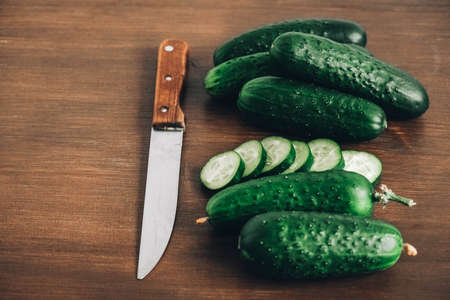 Sliced fresh green cucumbers with a knife on a wooden background. Top view. Copy, empty space for text.