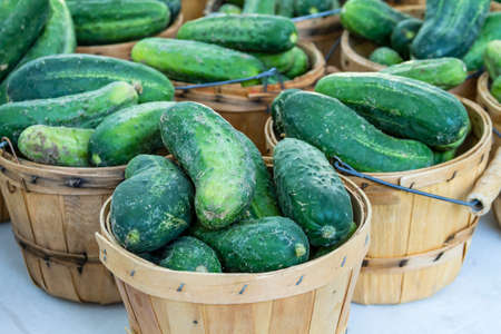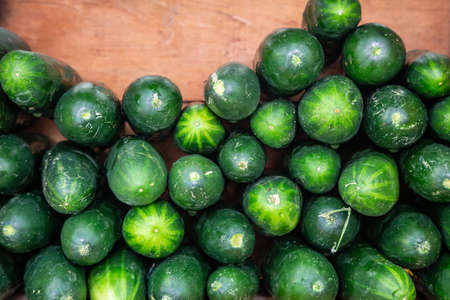 Fresh organic green cucumbers on fresh market, background. Сucumbers texture. A lot of organic sucumbers root