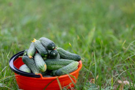 Fresh cucumbers in an orange bucket against a background of green grass.