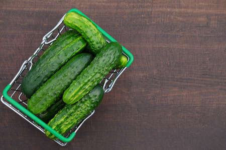Green cucumbers in a metal shopping basket on a wooden brown surface. Banner, close-up, selective focus, flat lay, top view, copy space
