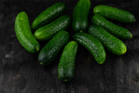 Parts of whole fresh cucumbers on a dark background. Space for the text. Top view.