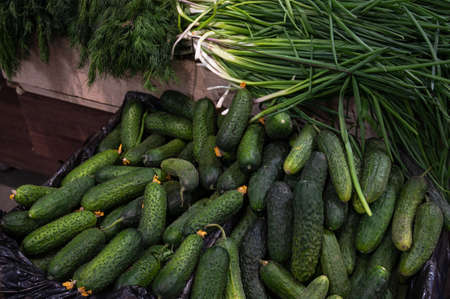 Cucumber background Cucumber harvest. many cucumbers. cucumbers from the field. Landscape. A backdrop of cucumbers. Street vegetable market,