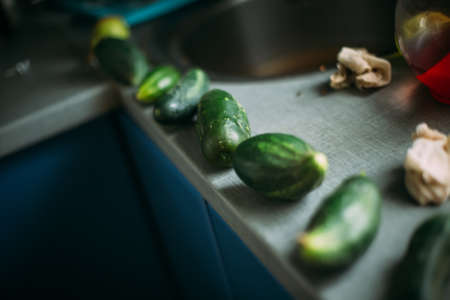 A row of cucumbers on the edge of the table. Harvest of ripe cucumbers at the beginning of the vegetable growing season on the ground