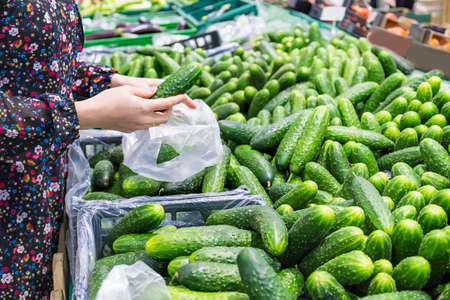 A woman chooses cucumbers in a supermarket. Selective focus. Food.