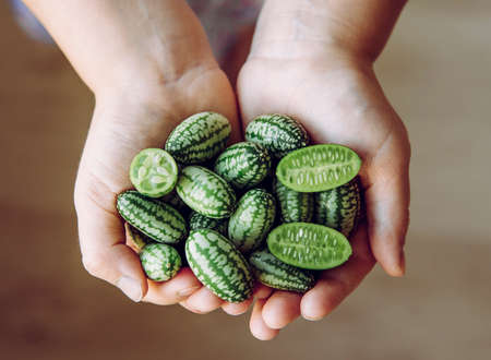 Child hands holding Melothria scabra, also known as the cucamelon or pepquinos witch is small edible fruit witch tastes like cucumber and melon. Healthy alternative snack.