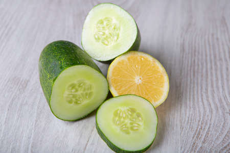 Good food for health and diet lemons and cucumber on wood