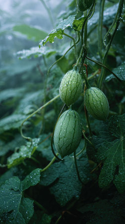 Gac fruit farm summer green. Baby Jackfruit, spiny bitter Gourd, Sweet Gourd, Cochinchin Gourd.