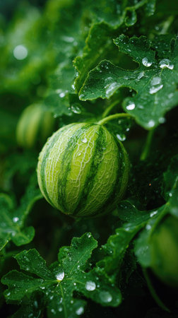 Galia melon in gentle light rain, soft raindrops visible on vivid green leaves, natural realistic style, bright fresh colors, balanced wide composition, cinematic framing, highly detailed.