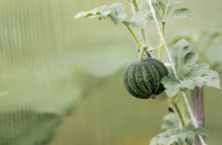Growing watermelons in a greenhouse. Stems, green leaves, and a small watermelon. Gardening and harvesting for a healthy diet.