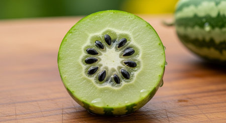 A sunlit portrait of a single Winter melon, photographed outdoors on a clear, breezy day. Fresh, crisp air renders vivid detail in the leave veins glowing with gentle backlight. The background falls into a soft natural bokeh of greenery, colors truetolife, organic beauty in pure sunlight.