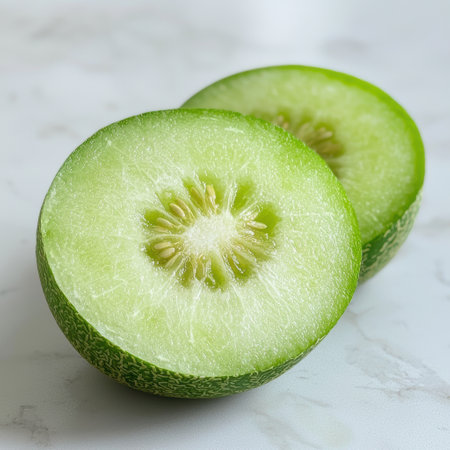 Galia melon break in half over parsley background. closeup