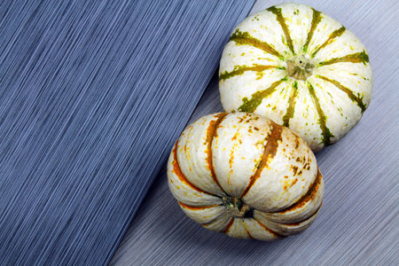 Two white striped pumpkins on a grey stone background with copy space