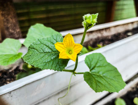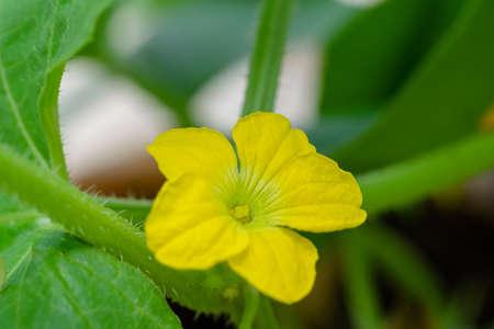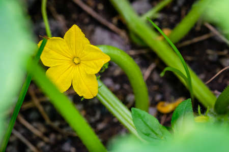 Organic home growing, Cucumber flower macro on creeping vine, species Cucumis sativus. Native from South Asia, but domesticated worldwide.