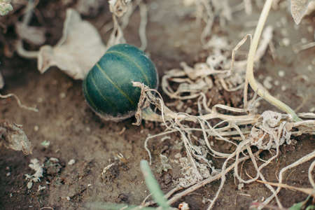 Fresh green carnival squash with water droplets on rough skin resting on soil