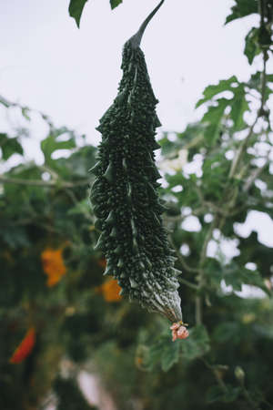 closeup shot of young bitter gourd at bud stage
