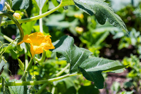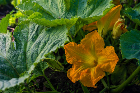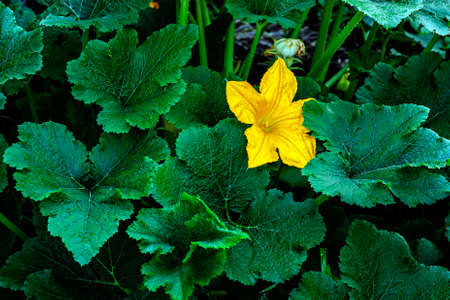 Zucchini or courgette flowers in garden. A vibrant yellow flower atop a green stem with large leaves