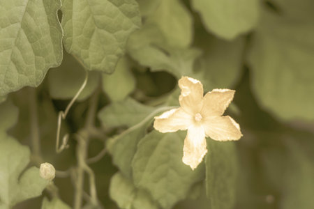 Yellow flower of Angle luffa bloom in the garden. Close up of sponge gourd flower.