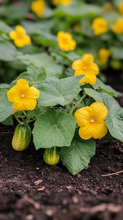 Lush green cucumber plants flourish beside yellow flowers in a garden. The scene is vibrant with healthy vegetables and blooms under a clear summer sky.