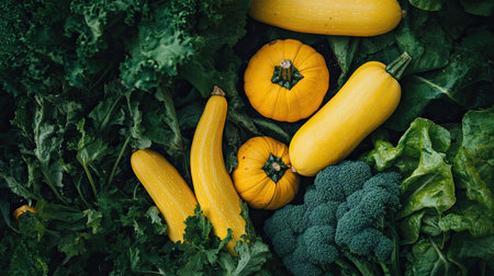 A vibrant collection of fresh organic vegetables including yellow squash and broccoli surrounded by leafy greens, perfect for healthy meal inspiration.