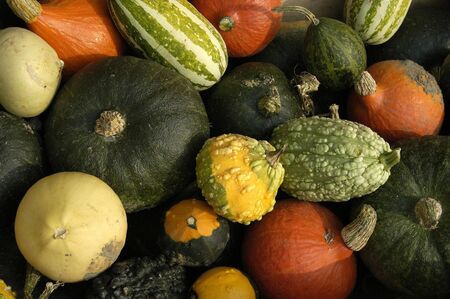 Lots of colorful autumn pumpkins and squashes