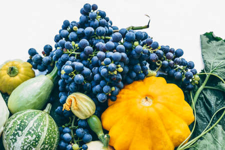 Blue grapes and yellow and green pumpkins on a white background. Harvest from the country garden.