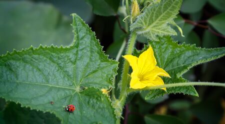 The garden is planted with the young plant of cucumber with yellow flower and green leaves, which creeps ladybug.