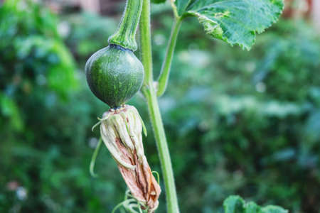 Green pumpkin growing in the vegetable garden. Growing pumpkins. Pumpkin plant. Young pumpkin growing on the vegetable patch.