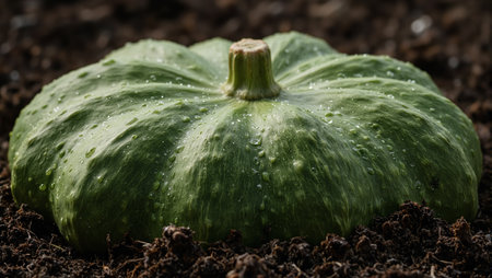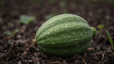 Fresh green Hubbard squash on soil glistening with water droplets