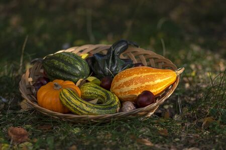 Decorative autumn pumpkins, various kinds in shallow wicker basket on green grass and autumn yellow leaves, green and orange colorful squashes and brown chestnuts