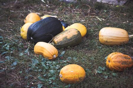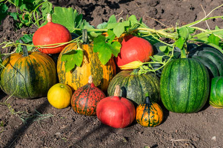 A bunch of different multi-colored pumpkins. Many pumpkins of different varieties. Autumn harvest of pumpkin. Harvesting in the village.