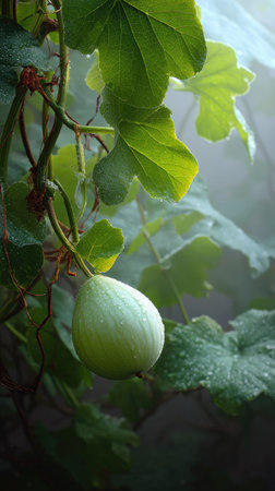 The Bottle gourd in light fog, dew on leaves, light soft diffused, threequarter view.