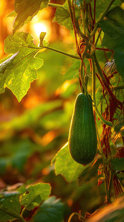 The Bottle gourd at sunset, Golden red sunset light filters through the leaves, still atmosphere, warm orange glow blending with natural green
